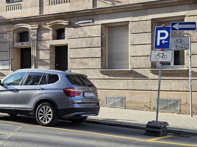 Es gibt einen benutzungspflichtigen Radweg an der Fronmüllerstraße auf Höhe des Südstadtparkes Richtung Schwabacher Straße. Dieser Radweg ist von der Straße durch ein Kiesbeet und parkenden Autos abgegrenzt, es gibt also keine Möglichkeit auf die Straße zu wechseln. Wegen einer Baustelle endet der Radweg hier einfach, dabei wäre es so einfach: man könnte die Radfahrer genauso wie die Fußgänger durch den Südstadtpark umleiten. Auf der anderen Seite des Parkes bei der Baustelle an der Flößaustraße geht es ja auch.