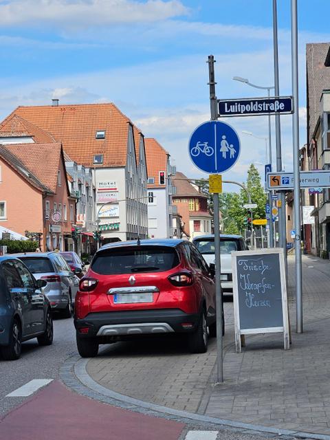 Zwei ältere Damen wären zum Kaffee trinken wohl am liebsten mit ihrem SUV gleich in die Bäckerei hineingefahren, da der Wagen aber nicht durch die Tür paßt, wurde einfach auf dem Radweg vor der Bäckerei geparkt, so daß kein Radfahrer mehr durch kommt und auf die Straße oder den Gehweg ausgewichen werden muß. Hinter dem davor stehenden weißen Wagen waren alle Parkplätze frei, aber dann hätte man ja 10m weiter zu Fuß gehen müssen, das ist natürlich nicht zumutbar. Da werden lieber Fahrradfahrer gefährdet.